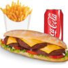 Salade, tomates, oignons, 2 steaks, cordon Bleu , cheddar + frites + 1 boisson 33cl