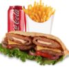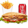 Salade, tomates, oignons, 2 steaks, 2 bacon, cheddar + frites + 1 boisson 33cl