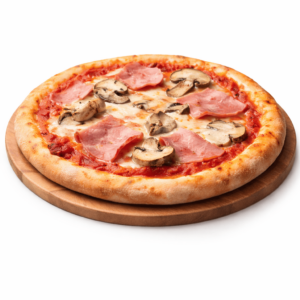 Sauce tomate, fromage, champignons, jambon