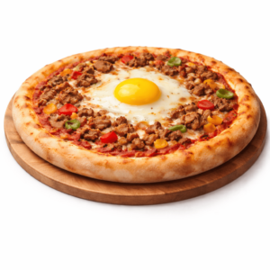 Sauce tomate, fromage, viande hachée, poivrons, oeuf