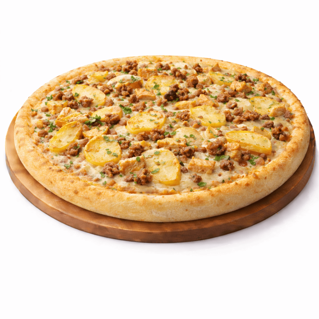 Sauce tomate, fromage, viande hachée, merguez, poulet