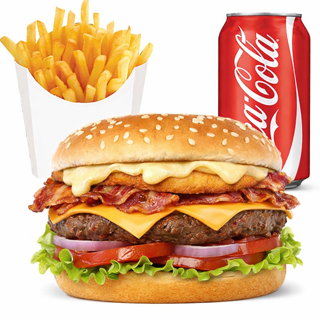 1 Steak 150gr, bacon, galette de pommes de terre, raclette, cheddar, salade, tomates,oignons