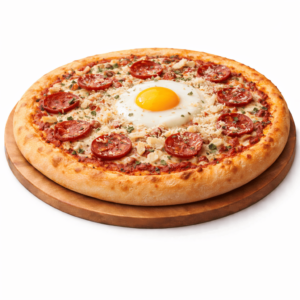 Sauce tomate, fromage, peperoni, oeuf