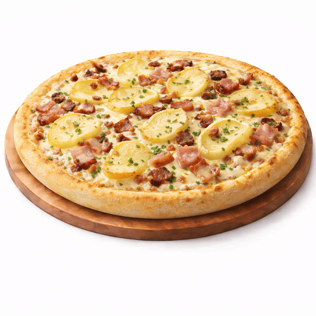 Sauce tomate, fromage, lardons, oignons, oeuf