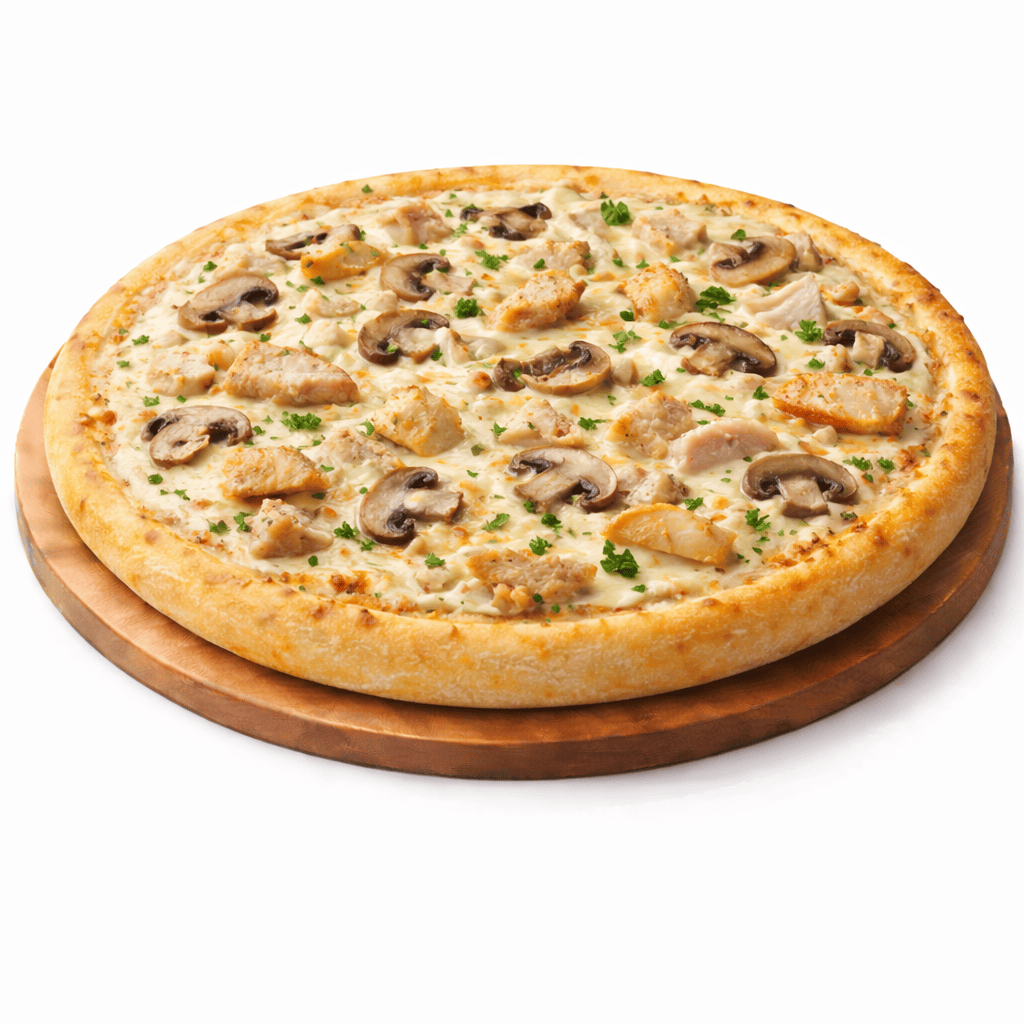 Sauce tomate, fromage, poulet, oignons, poivrons, olives
