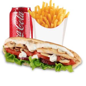 Salade, tomates, oignons, poulet, crème fraîche, boursin, champignons + frites + 1 boisson 33cl